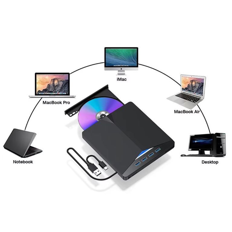 מכשיר הקלטה CD/DVD RW עם מפצל USB3 4 כניסות + קורא כרטיסים. חיבור DVD-RW USB 3.0 — TYPE-C 0+ USB